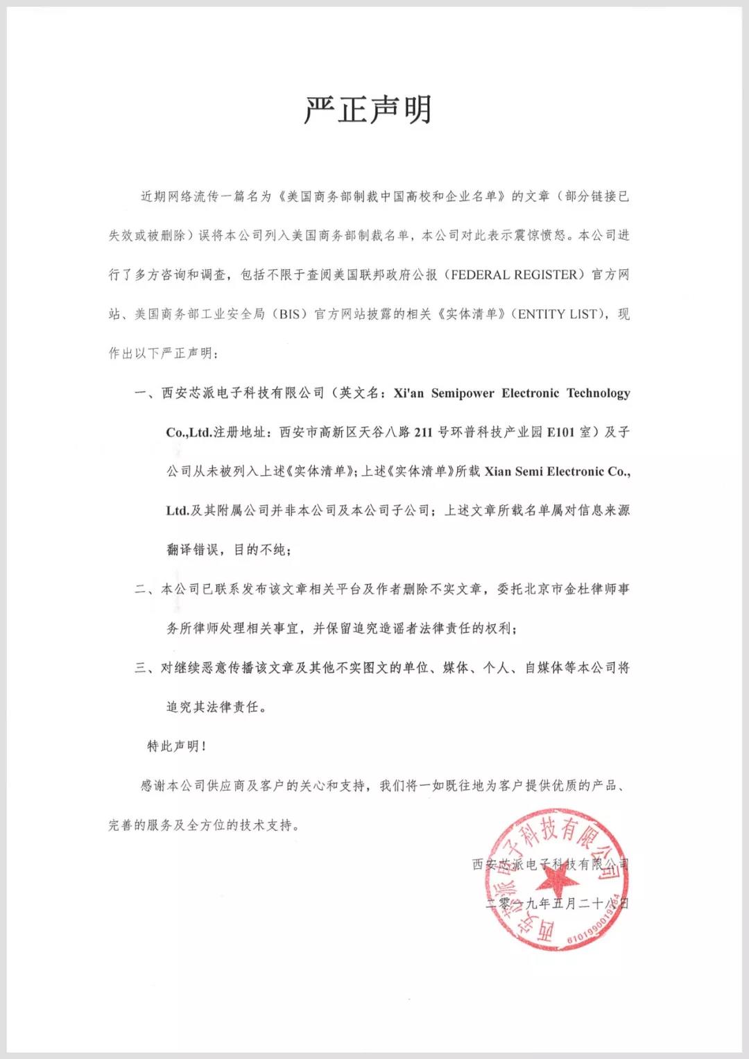 一、 西安芯派電子科技有限公司(英文名:Xi'an Semipower Electronic Technology Co.,Ltd.注冊地址:西安市高新區(qū)天谷八路211號環(huán)普科技產(chǎn)業(yè)園E101室)及子公司從未被列入上述《實體清單》;上述《實體清單》所載Xian Semi Electronic Co., Ltd.及其附屬公司并非本公司及本公司子公司;上述文章所載名單屬對信息來源翻譯錯誤,目的不純;